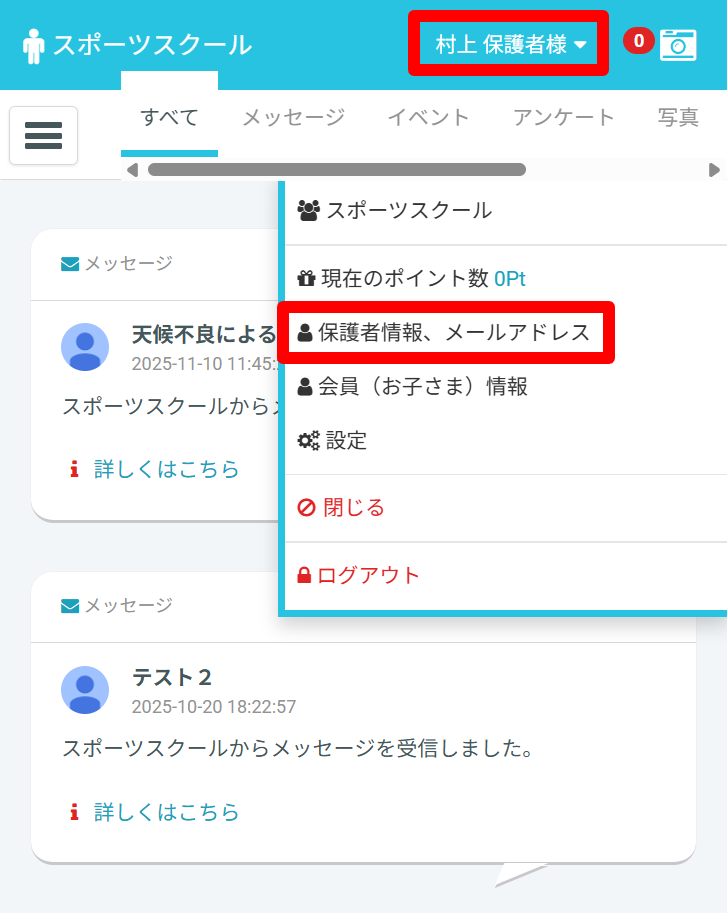 PiCROにログインし、右上にあるご自身のお名前を選択してください。下にメニューが表示されます。