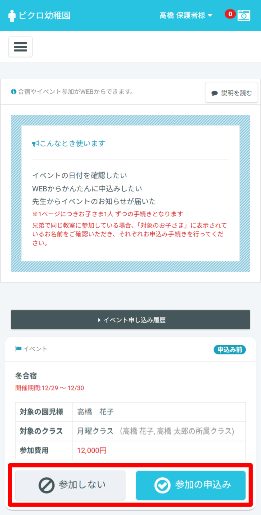 「参加しない」または「参加の申込み」を押してください。