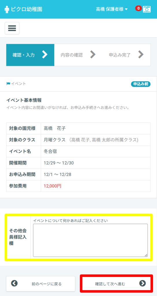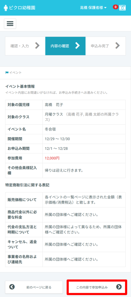 「この内容で参加申込み」(または「この内容で不参加を確定する」)を選択すると、申込みが完了します。