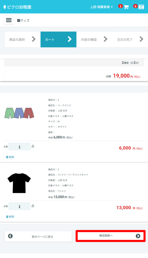 カートへ入れた商品が表示されますので問題がなければ「確認画面へ」を選択してください。