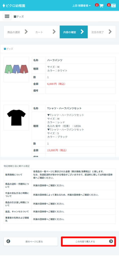 注文内容が表示されますので問題がなければ「この内容で購入する」を選択してください。