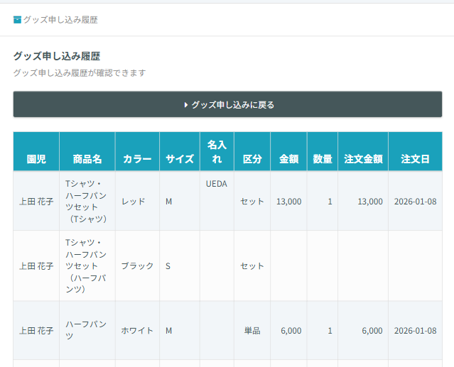 注文した商品が表示されています。商品のサイズや名入れなど詳細を確認することができます。
