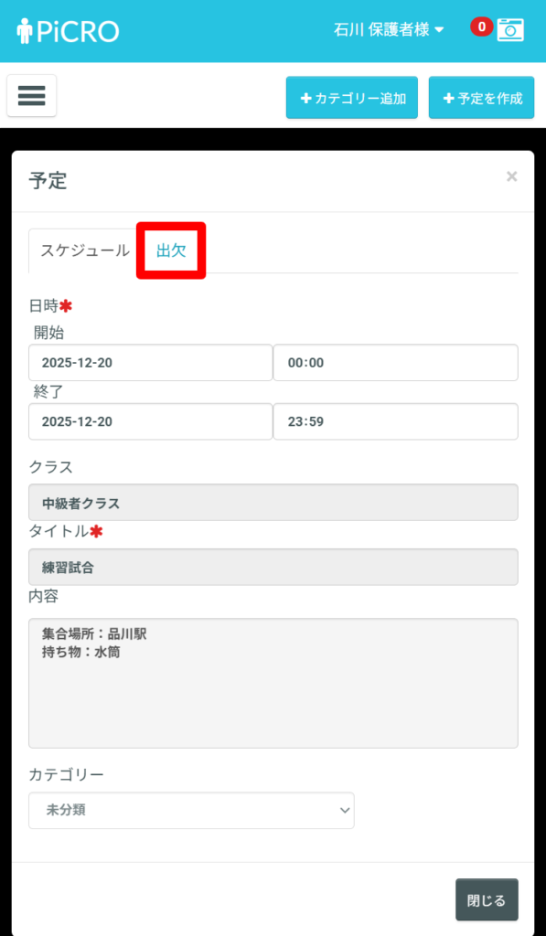 スケジュール名の前に[出欠]と付いているものが、出欠の登録が可能なものになります。
