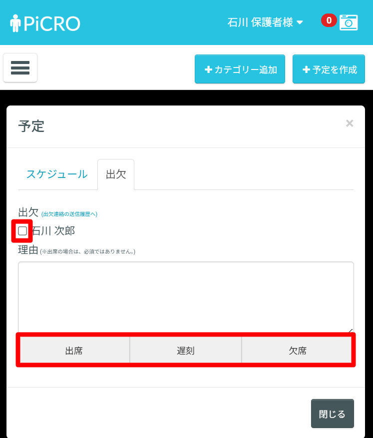 出欠を申請する会員名にチェックを入れ、理由を記入します。