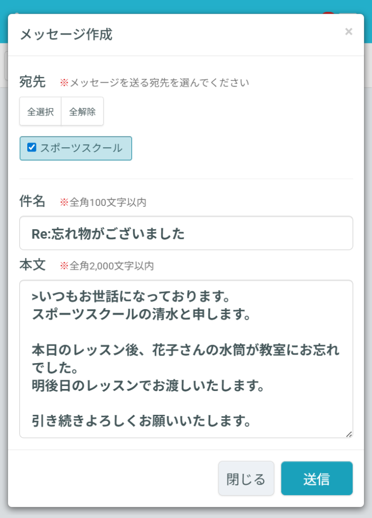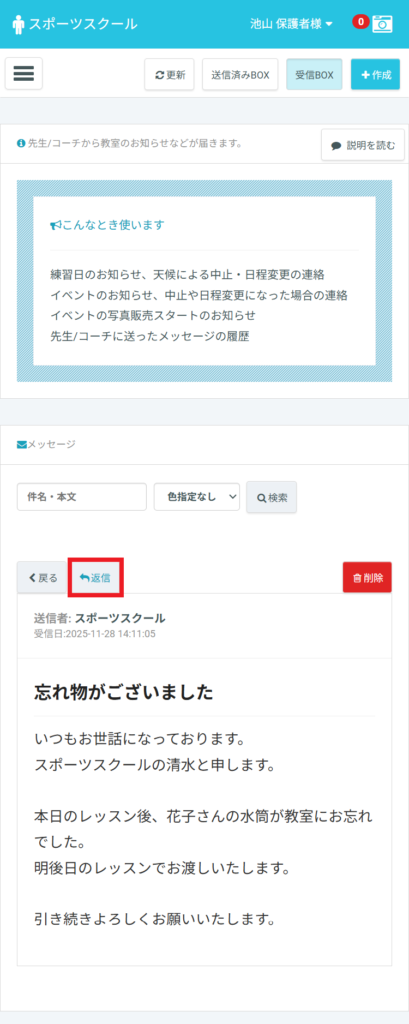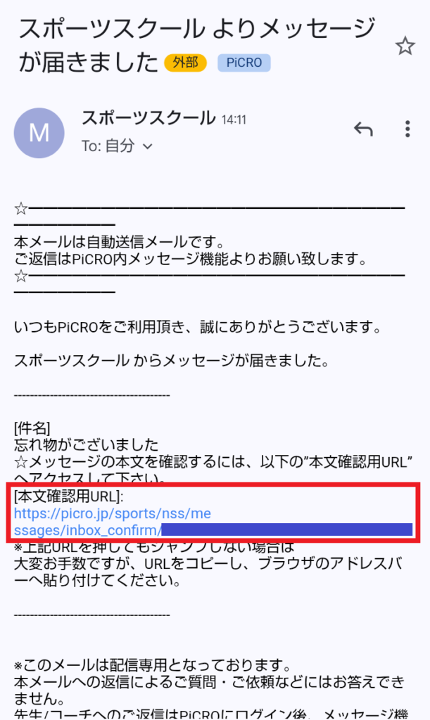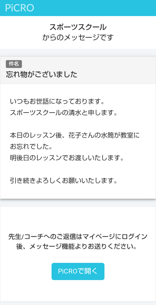 スクールからメッセージが送信されると、登録されているメールアドレス宛に通知メールが送信されることがあります。